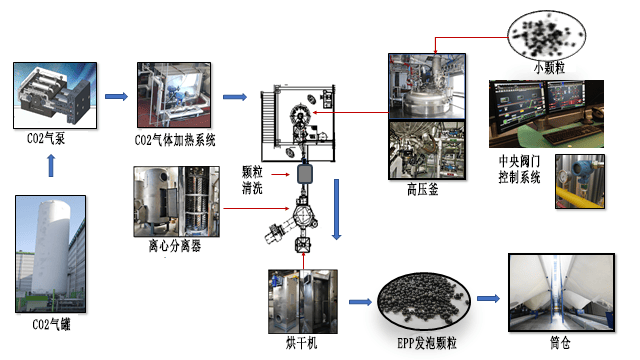 Epp材料生產(chǎn)所使用到的設(shè)備包括二氧化碳?xì)獗煤蜌夤?、氣體加熱系統(tǒng)、高壓釜、離心分離器、中央控制系統(tǒng)、烘干機(jī)、筒倉等。大致的作用可看上圖。